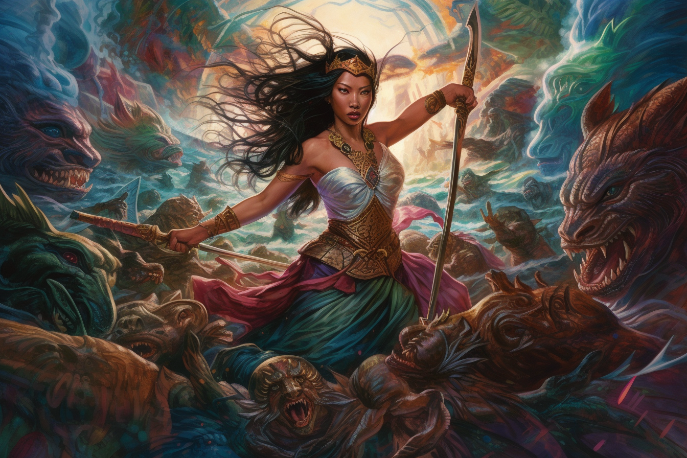 side-profile, heraldic parrot knights of the toucan-kingdom cross a high bridge covered in flowering vines and feathered flowers, ornate fantasy palace background, + style of Robert Mccall and Jean Giraud Moebius and Hayao Miyazaki, cinematic, dynamic, stunning, highly detailed, maximalism, opulism, 8k, high resolution --ar 16:9