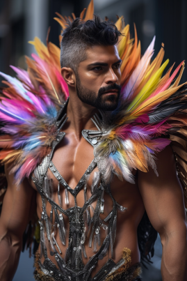 in style of Patrick Nagel:: [full body fashion portrait of two male models - a hafu muscular young man with flowing long curly hair koru tattoo and the other a polynesian muscular young man]:: both models have maori tattoos, both models wearing yoga pants and espadrilles black:: background of Honolulu skyline --v 5