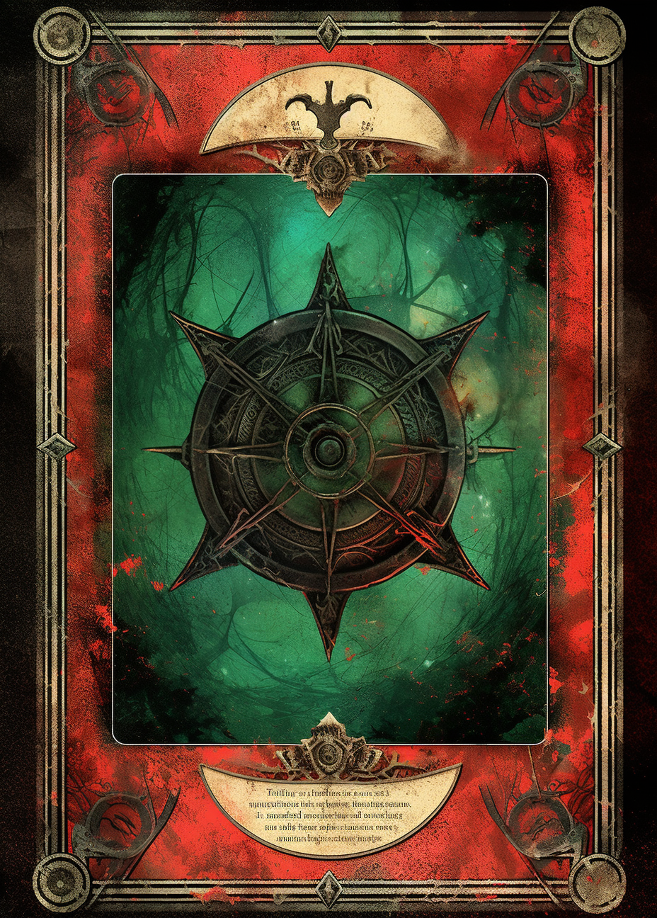 a dark fantasy card back, in the style of mythic imagery, texture-based, campcore, dark black red and emeraldgreen, artist's frame, free-associative, sense of awe, master panel composition, incorporate these themes <chaos, life, death, fortune, order, corruption, innovation> --ar 31:43