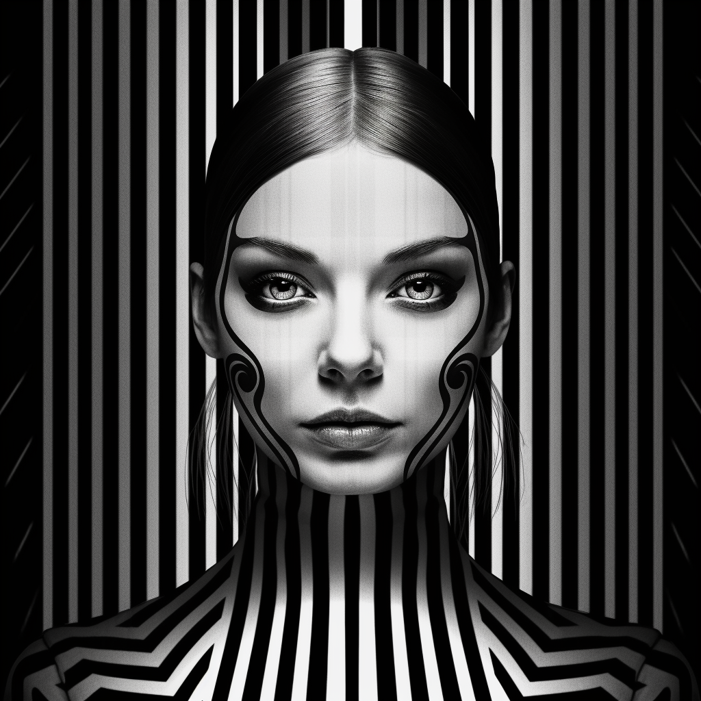 poster of beautiful striped face Joséphine Japy in the style of surreal cyberpunk iconography, black patterns, Shepard Fairey style, stencil style, graphic black and white, op art, isolated on a black background --upbeta