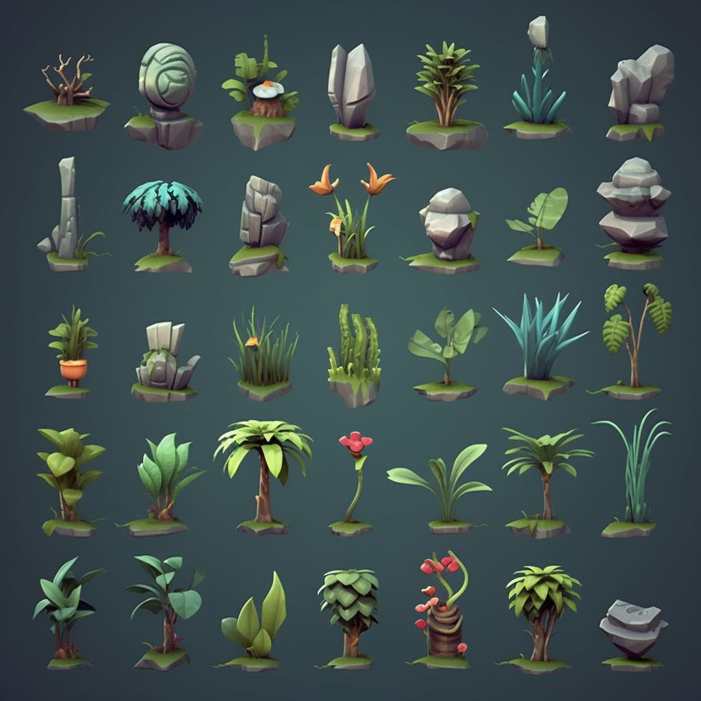 a series assets for a low poly game in a solid grey background, creative vegetation pack, jungle theme, game cg, game design, designed by Studio Ghibli --s 750 --v 5.1